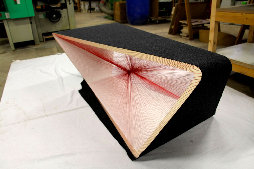 Cette pièce a été spécialement conçue et dessinée pour la biennale design de Pantin 2017. Le cordage traduit ici une mise en tension de la matière, laissant différentes lectures possibles au spectateur.