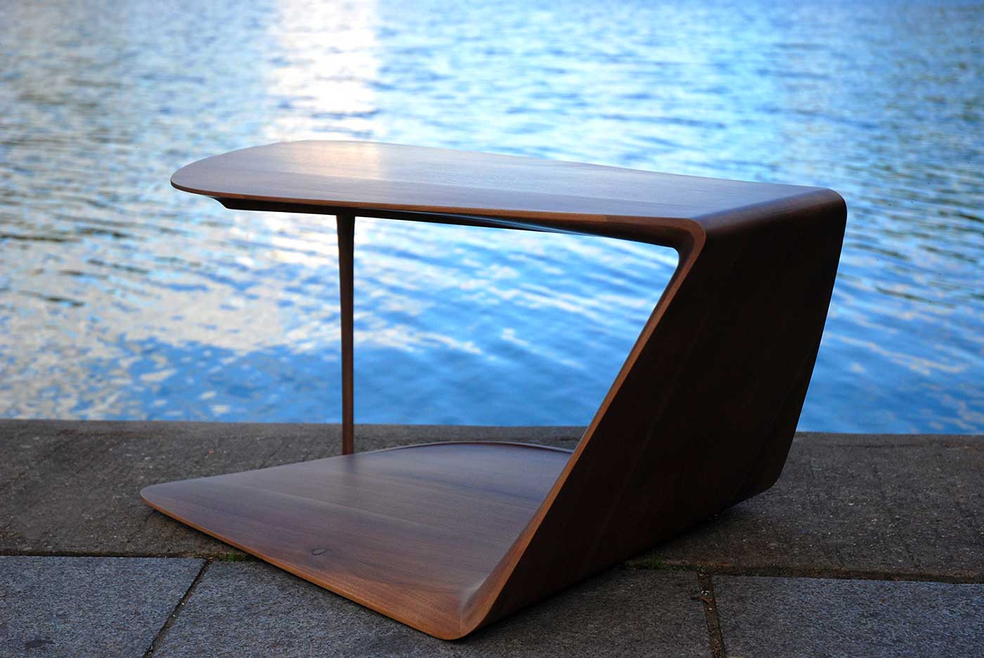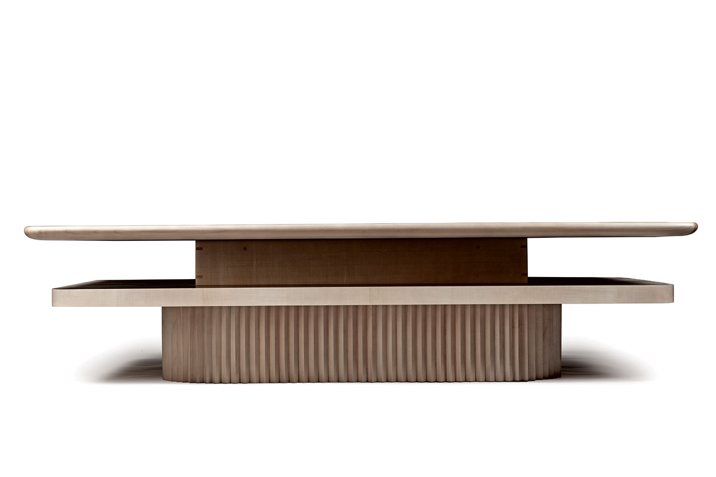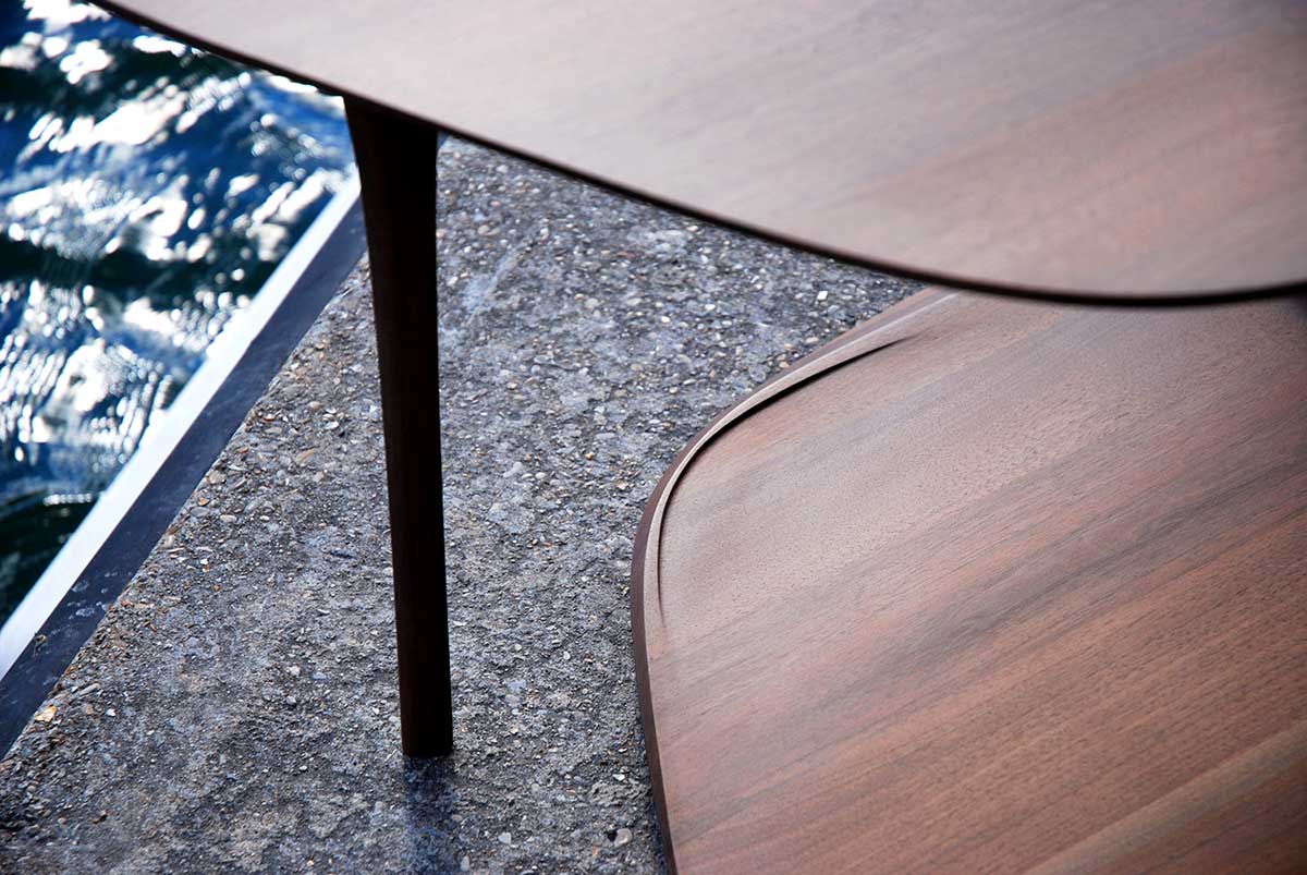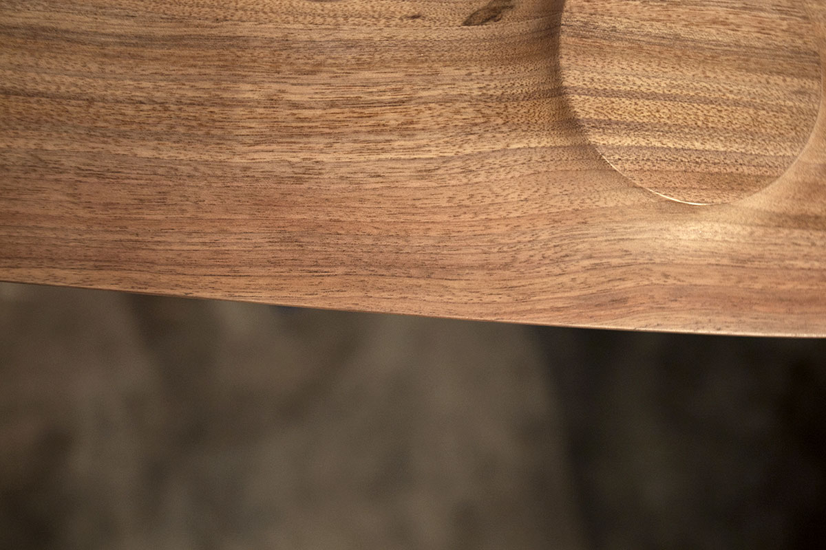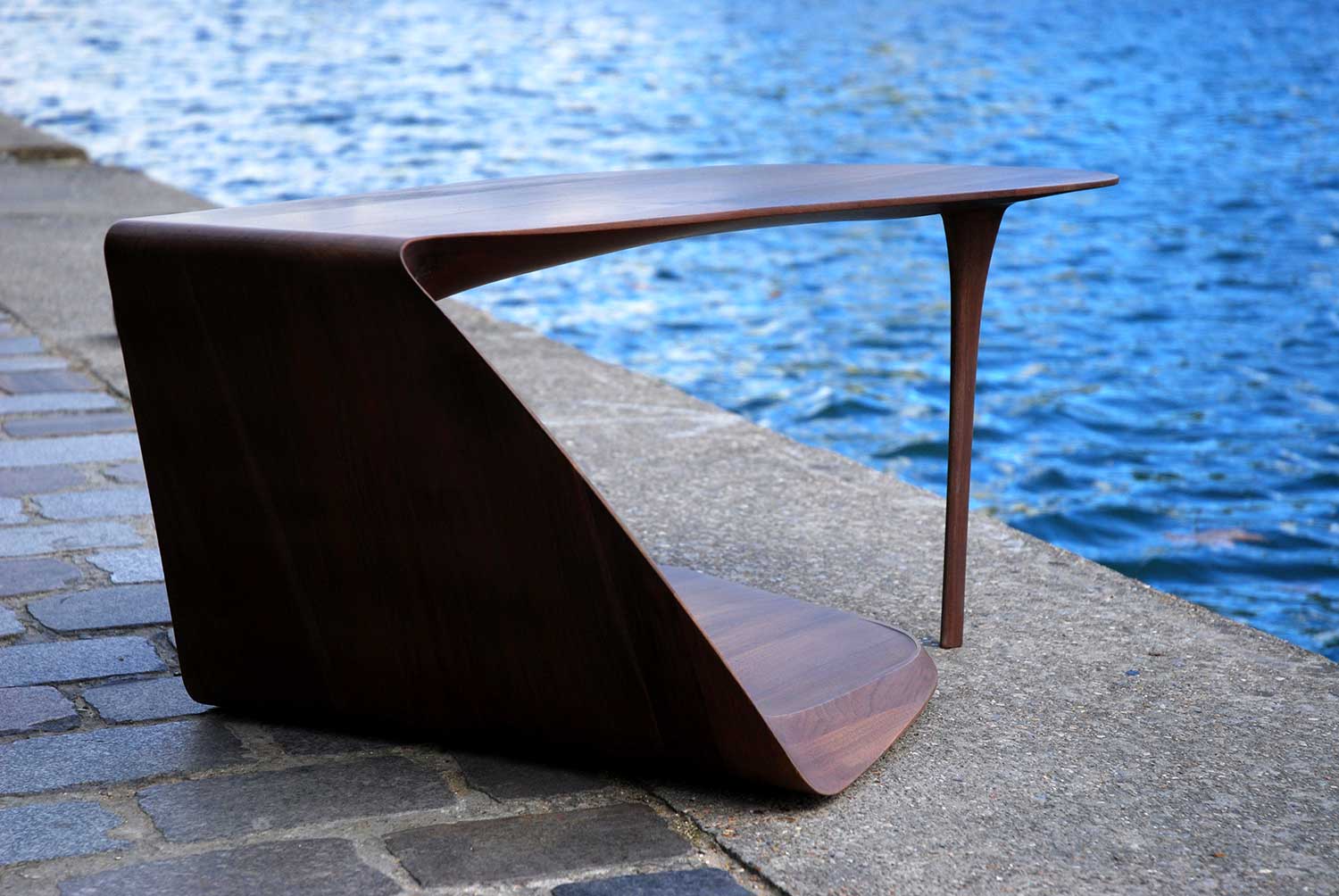 Cette table basse inaugure une lignée de mobilier sculpté où la fluidité des lignes est accentuée par le veinage particulier du noyer américain. Conçue en carte blanche, elle transpose dans la matière le mouvement d’un plan d’eau urbain traversé par le vent, où surface, tension et vibration deviennent structure.