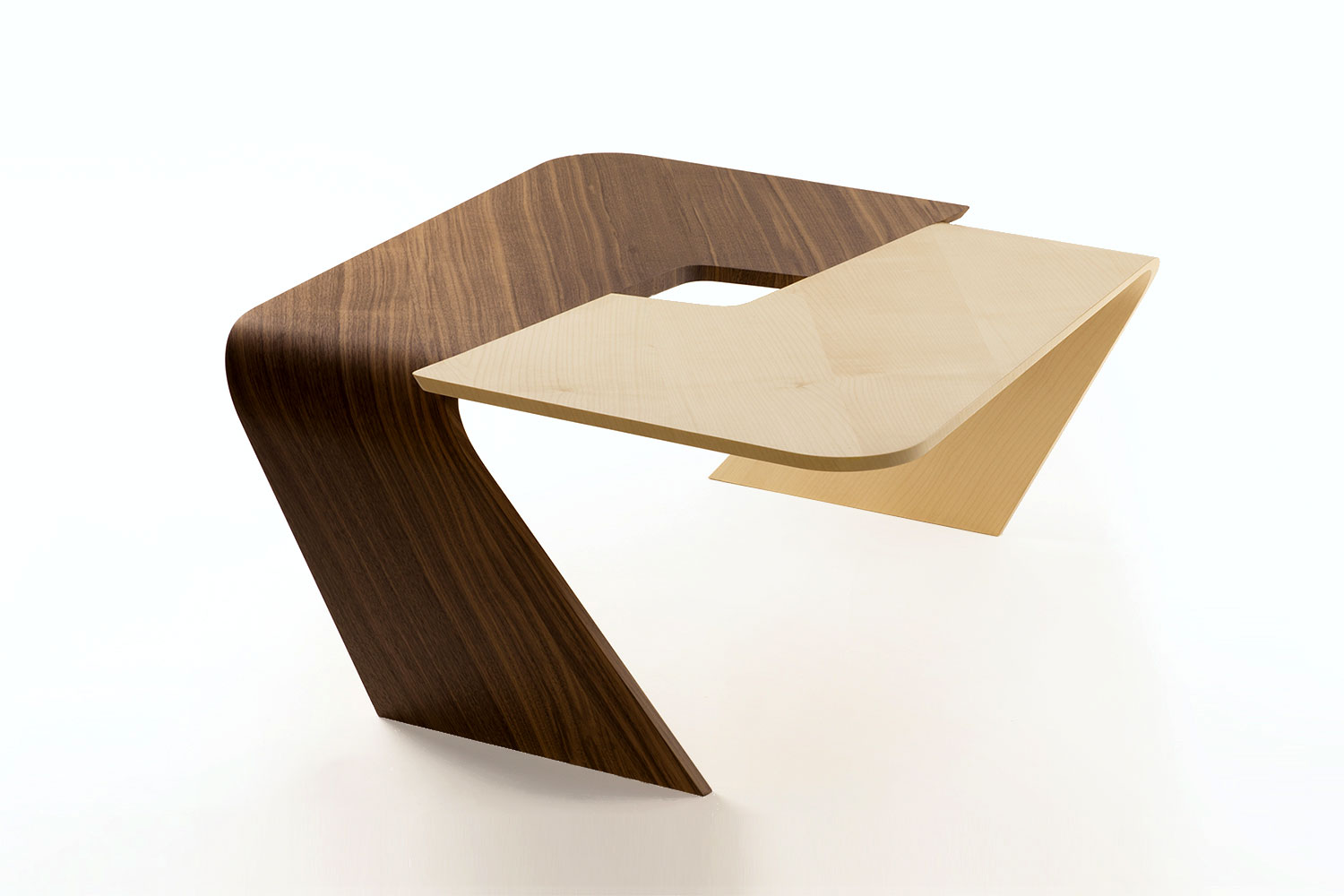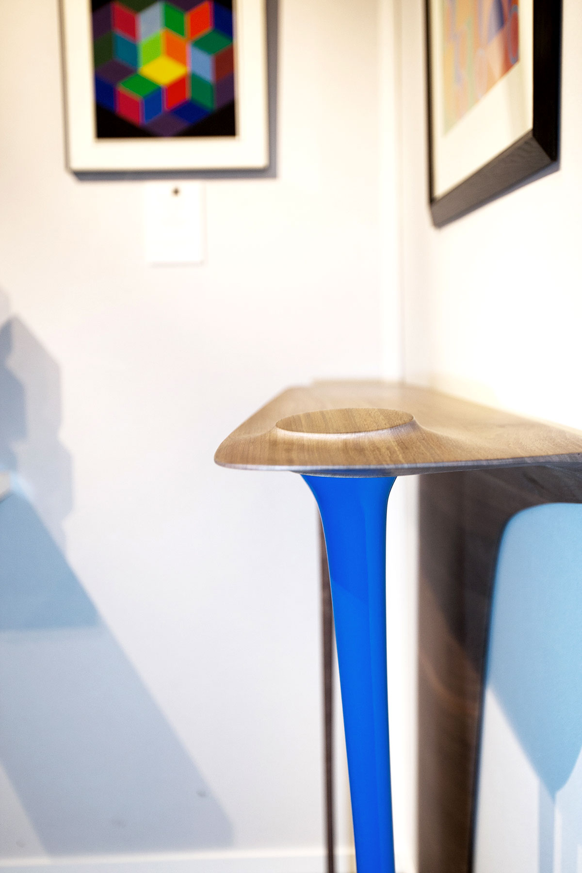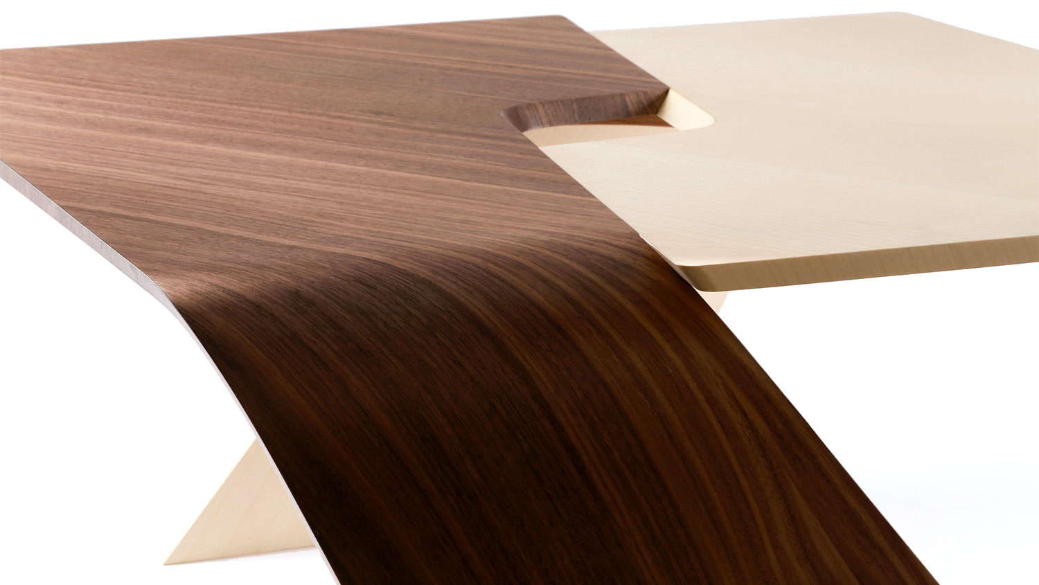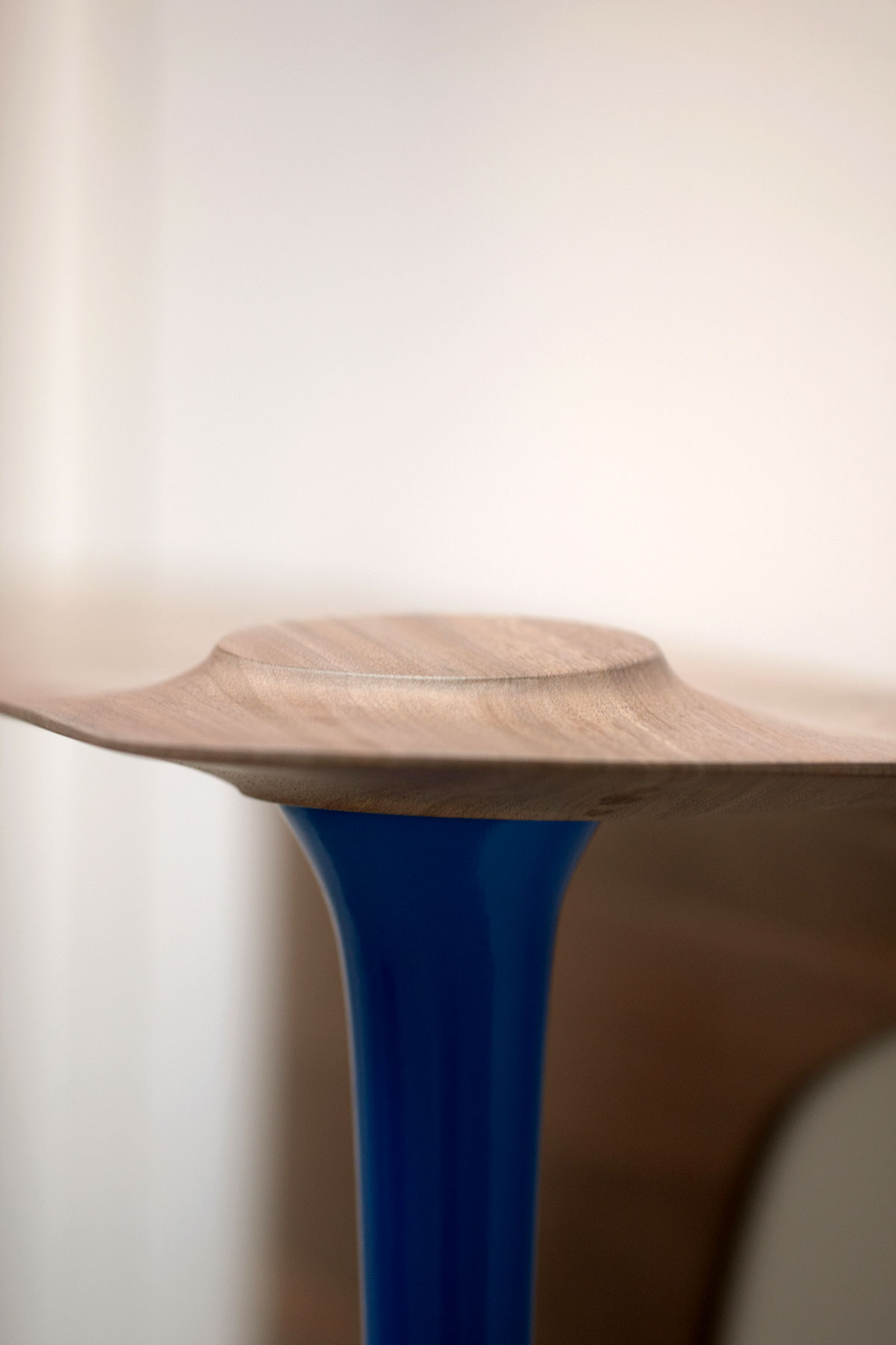 Cette table basse inaugure une lignée de mobilier sculpté où la fluidité des lignes est accentuée par le veinage particulier du noyer américain. Conçue en carte blanche, elle transpose dans la matière le mouvement d’un plan d’eau urbain traversé par le vent, où surface, tension et vibration deviennent structure.