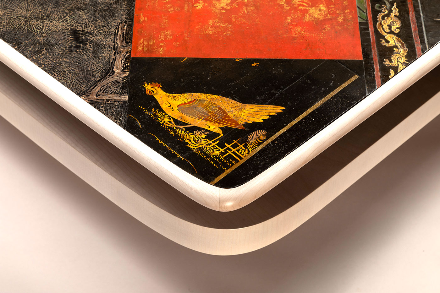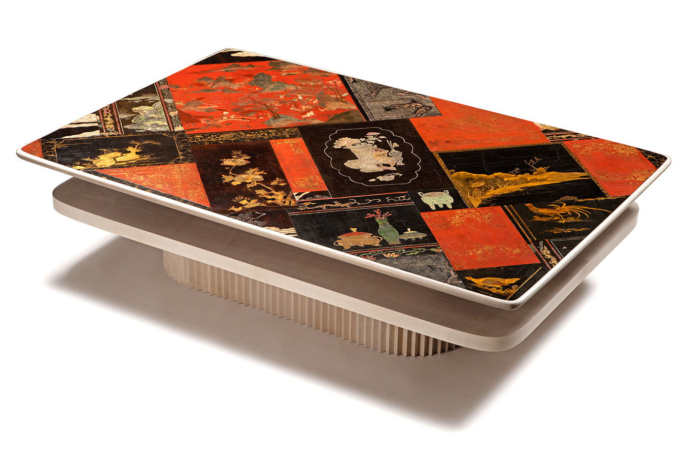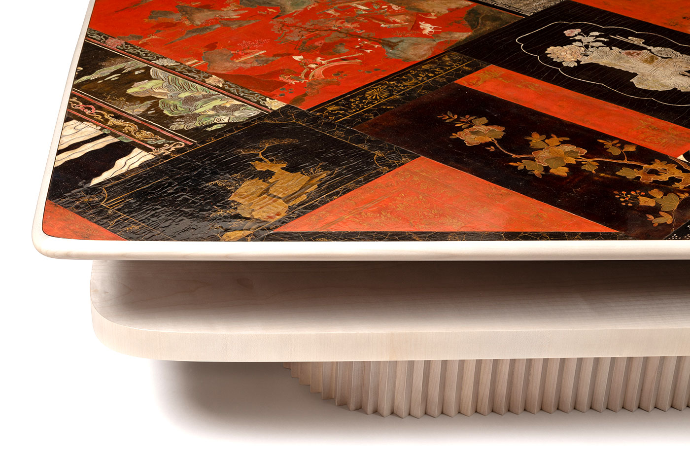 Au cœur de l’oeuvre, un ensemble de fragments de laques anciens, provenant d’époques et d’origines différentes, recomposés en puzzle.