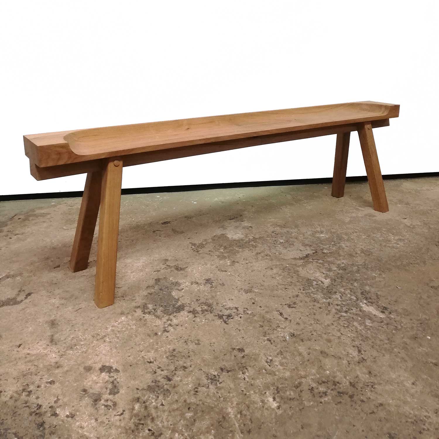 Inspiré par la pensée zen et l’esthétique du wabi-sabi, ce banc assume l’imperfection comme principe fondateur. Les fentes et les nœuds ne sont ni masqués, ou éliminés mais au contraire assumés, pansés si nécessaire, révélant la réalité du temps sur la matière. La forme est réduite à l’essentiel. Le geste décoratif vise la retenue, l’équilibre subtil du geste, de la matière et du silence.